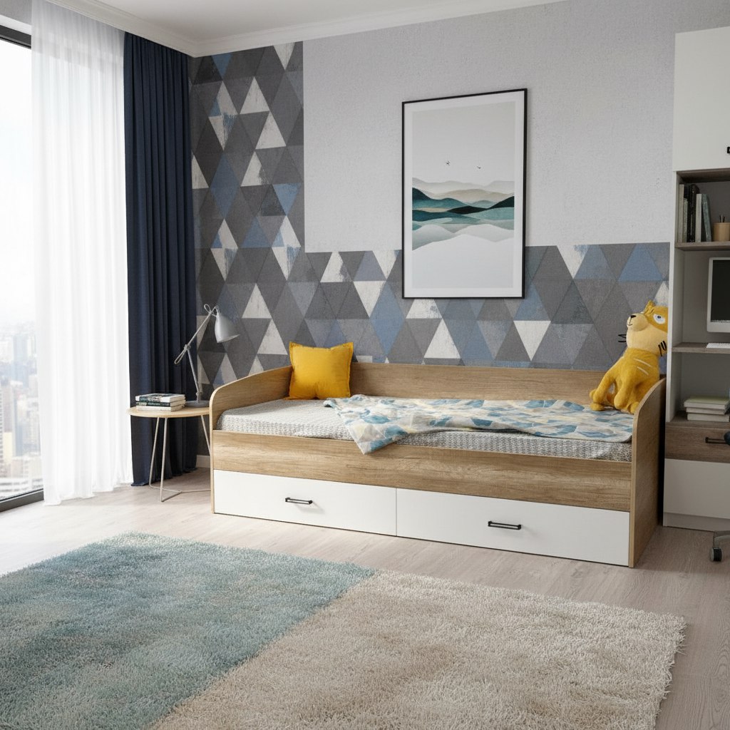 Кровать выполнена в современном дизайне, превосходно дополнит интерьер детской комнаты.