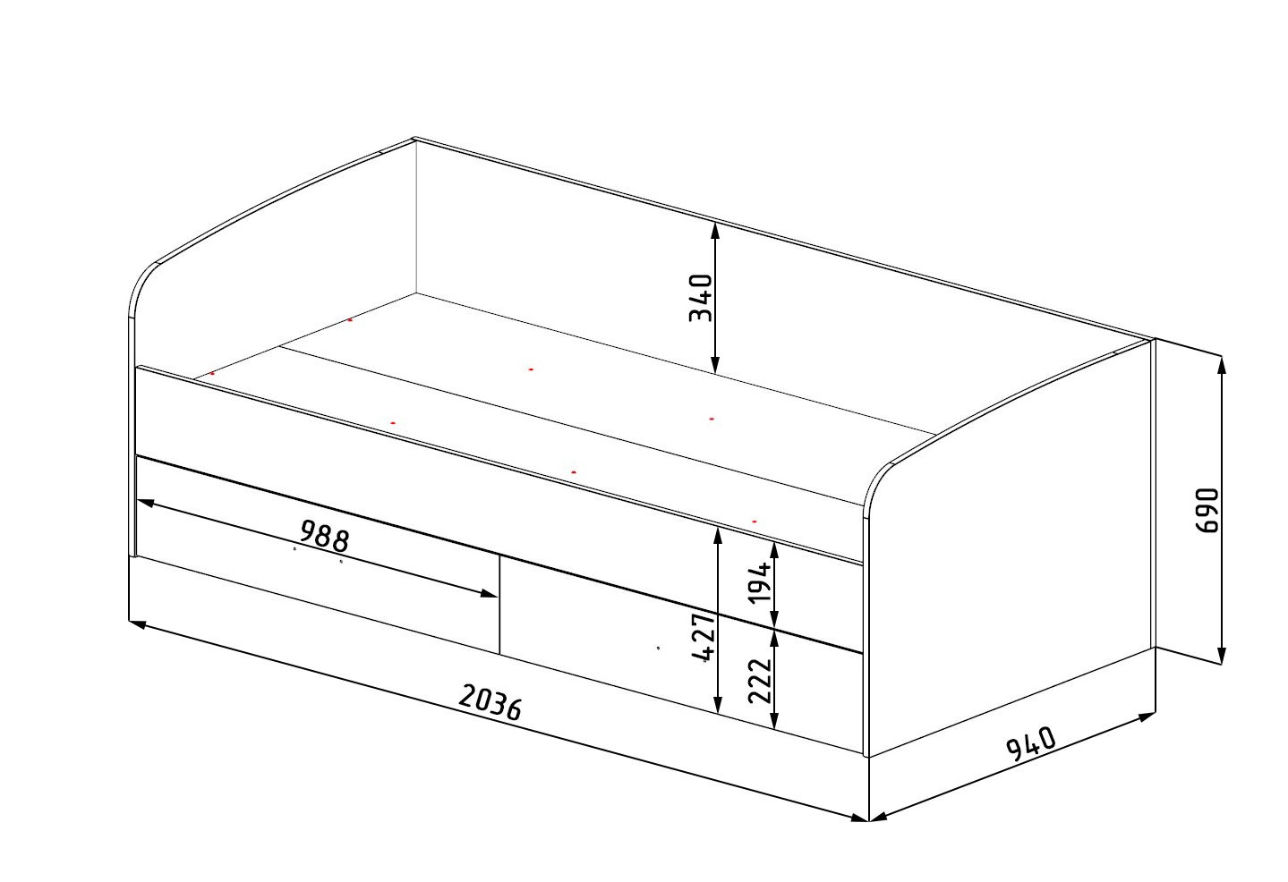 Габариты кровати: ширина 2036 х высота 690 х глубина 940 мм