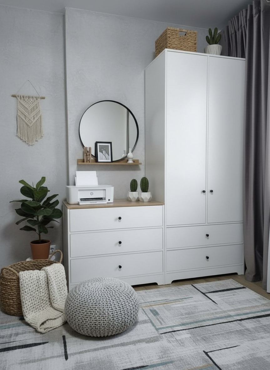 Шкаф поможет максимально грамотно использовать пространство, ведь у него есть два ящика для мелких вещей, штанга, верхние и боковые полки.