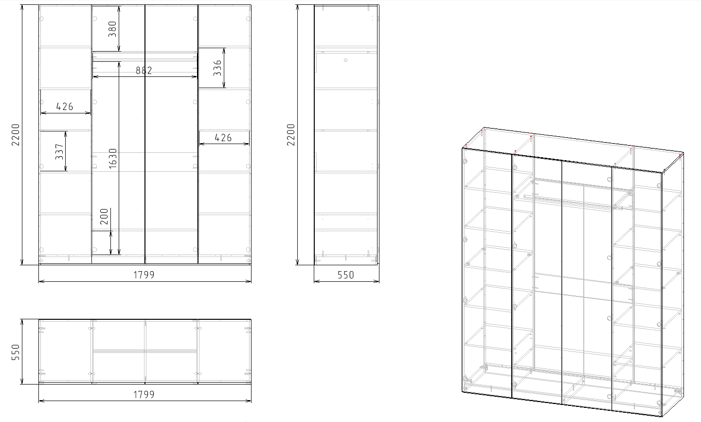 высота 2200 х ширина 1799 х глубина 550 мм