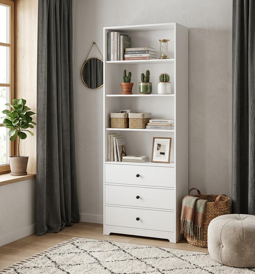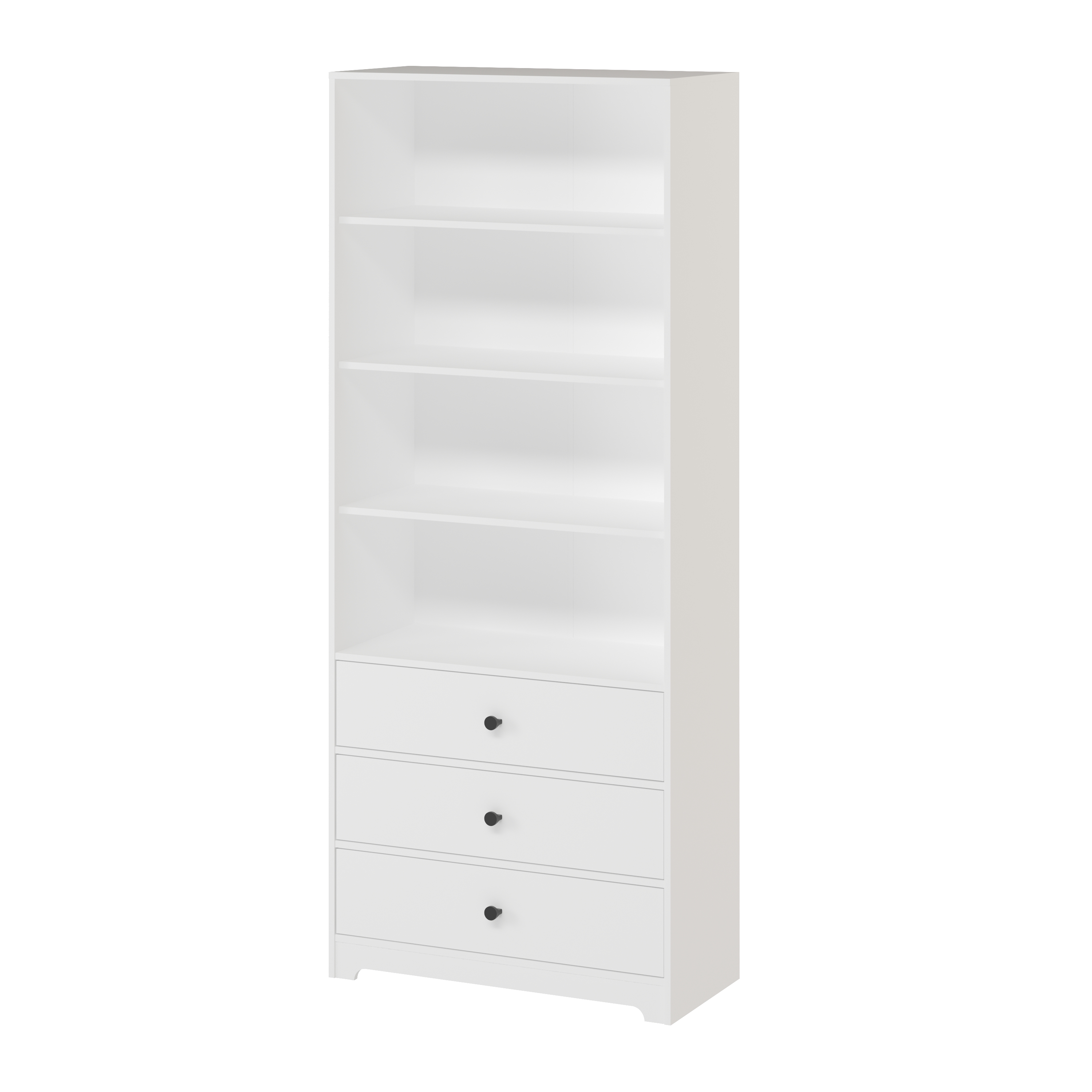 В стеллаж встроены три выдвижных ящика на направляющих скрытого монтажа с ДОВОДЧИКАМИ.