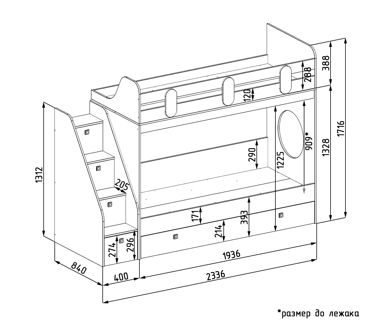 Габариты кровати с учетом лестницы: