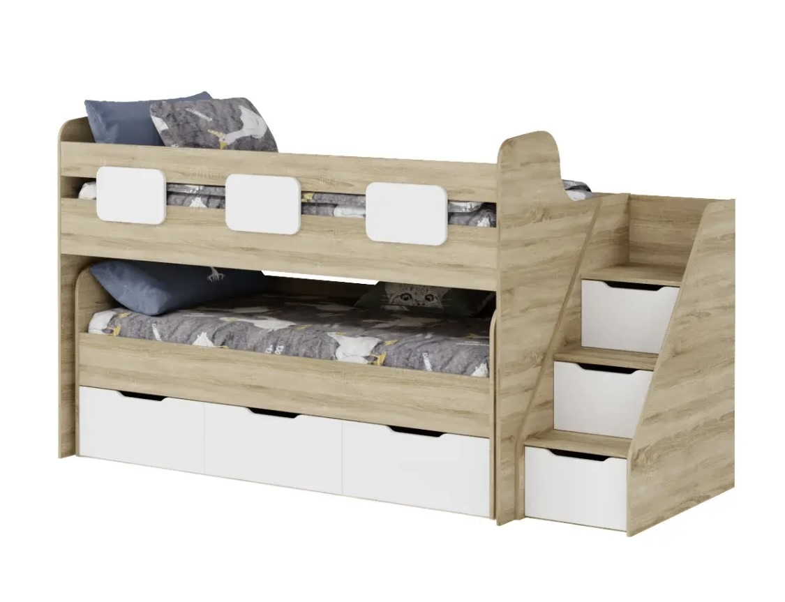 - Невысокая конструкция кровати обеспечивает удобный доступ на второй этаж, делая её идеальной даже для самых маленьких детей.