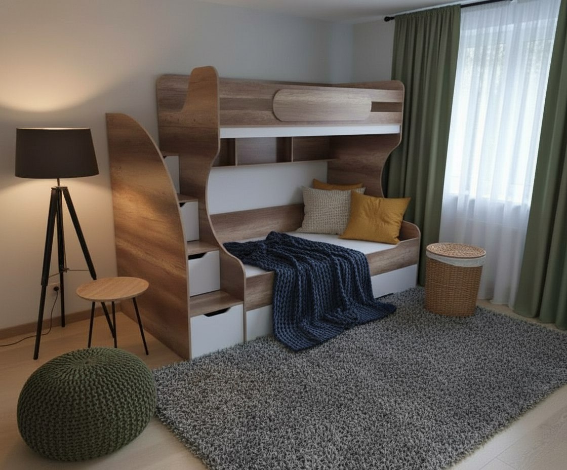 Увеличенное нижнее спальное место позволяет комфортно разместиться ребенку вместе со взрослым.