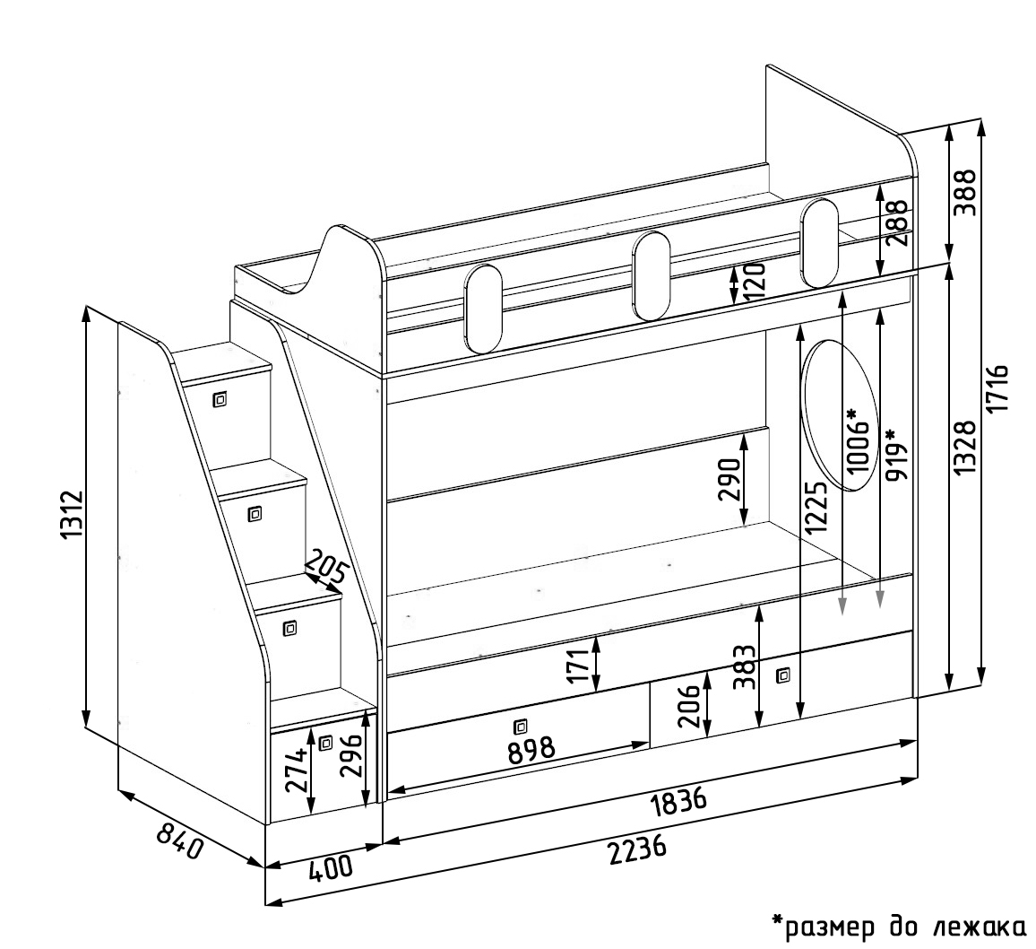 Габариты кровати с учетом лестницы: ширина 2236 х высота 1716 х глубина 840