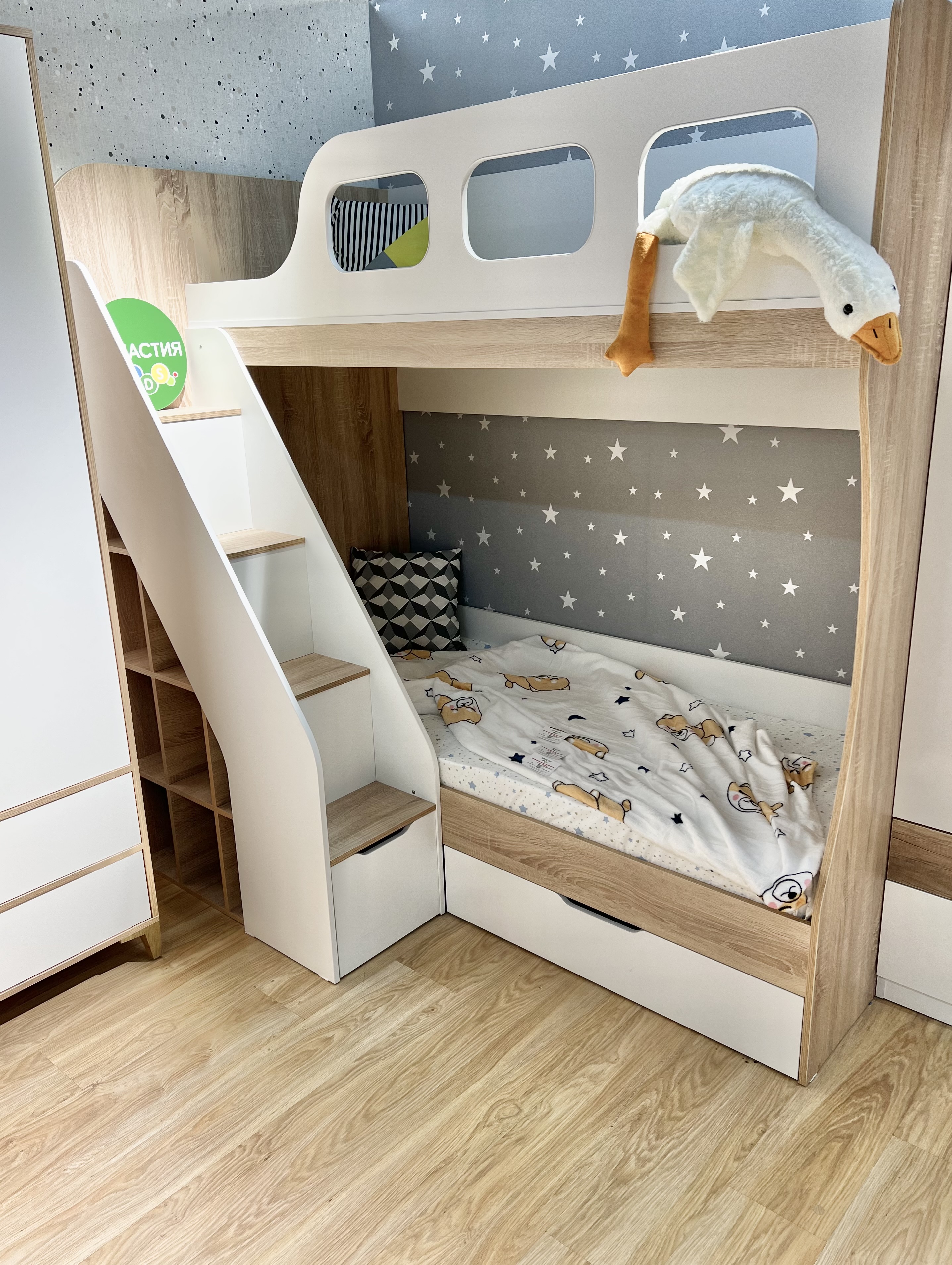 Высокая нагрузка на спальные места. Удобная лестница. Прочный, высокий, безопасный бортик |