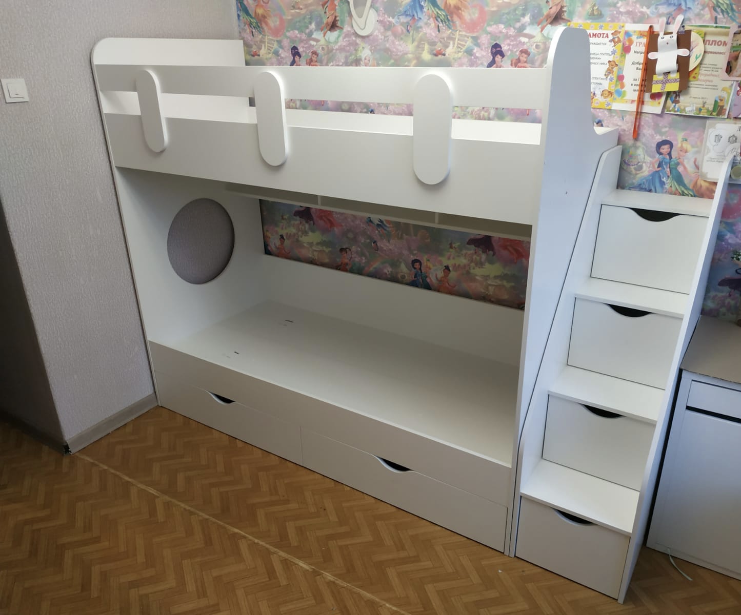 Основание кровати – прочный настил ЛДСП (НЕ РЕЙКИ!), который позволяет ребенку спать на ровной поверхности, что важно для детской спины.