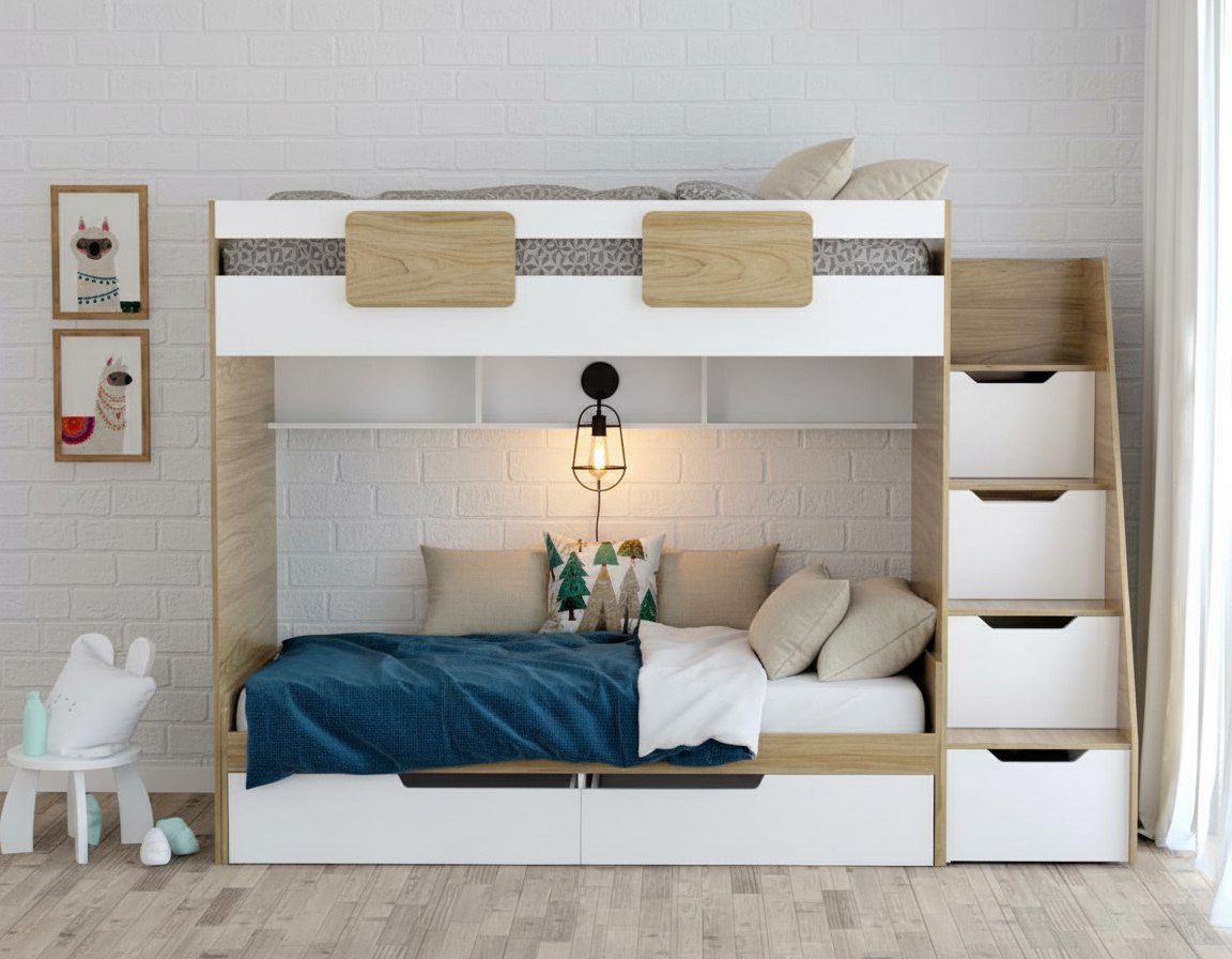 Данная модель позволит создать уютную детскую спальню для двоих детей, не перегрузив ее при этом мебелью.