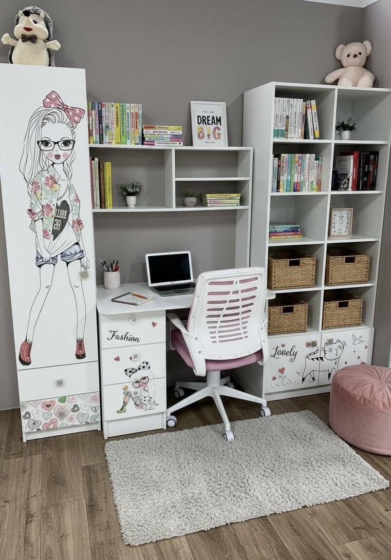 Мебель выполнена из сертифицированного, качественного, экологически чистого ЛДСП Е0,5 в белом цвете с дизайнерским принтом.