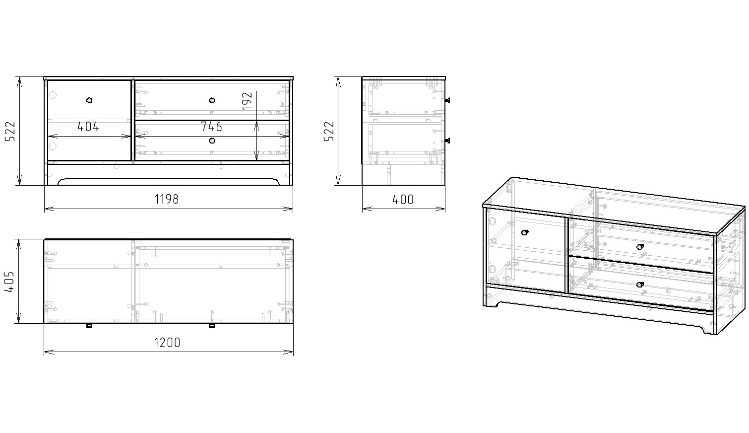 Габариты тумбы: ширина 1200, глубина 405, высота 522 мм