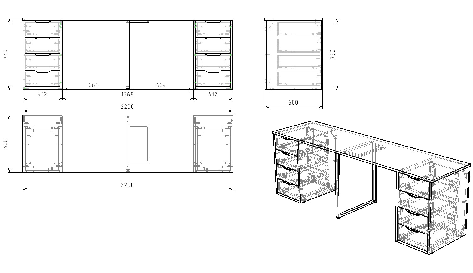 Доводчики, направляющие скрытого монтажа. Столешница и корпус тумб 22 мм. Дно ящиков прочное - выполнено из ЛДСП 16 мм (не ДВП!) |