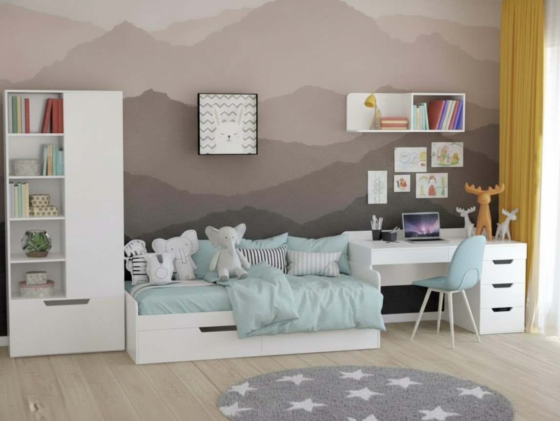кровать + стол + полка настенная + шкаф-стеллаж