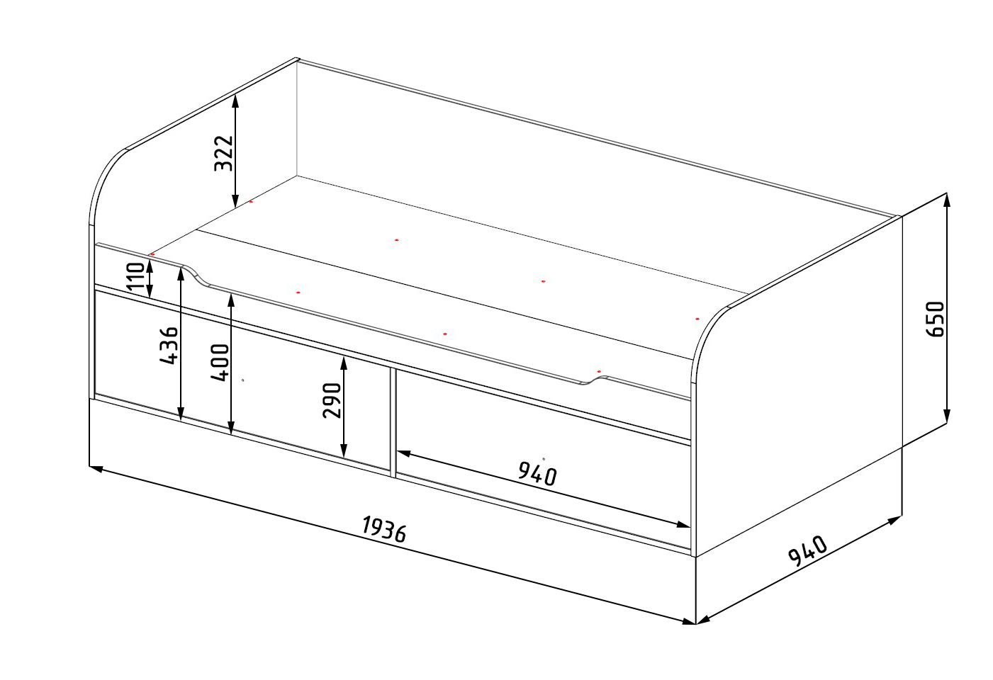 ширина 1936, глубина 940, высота 650 мм