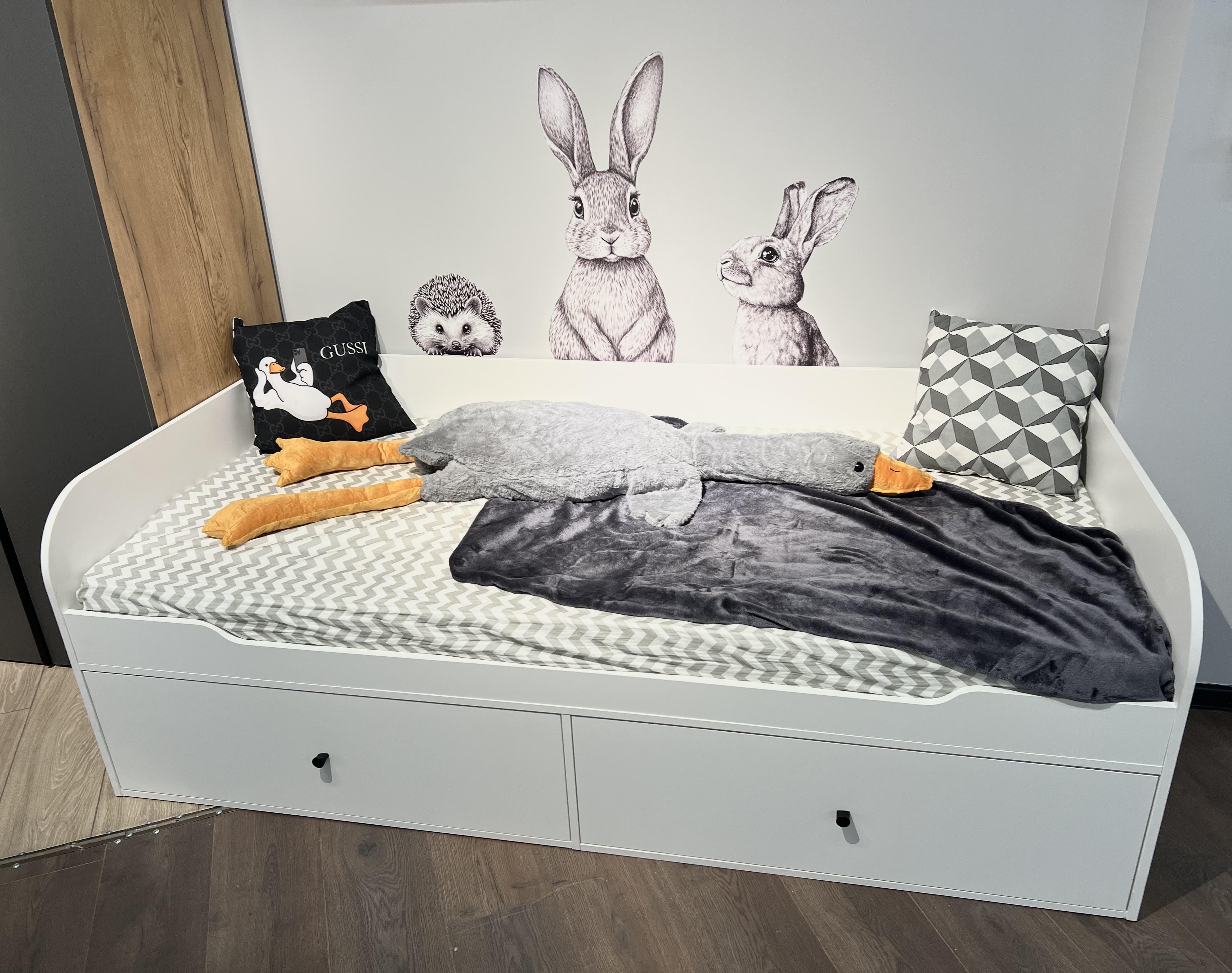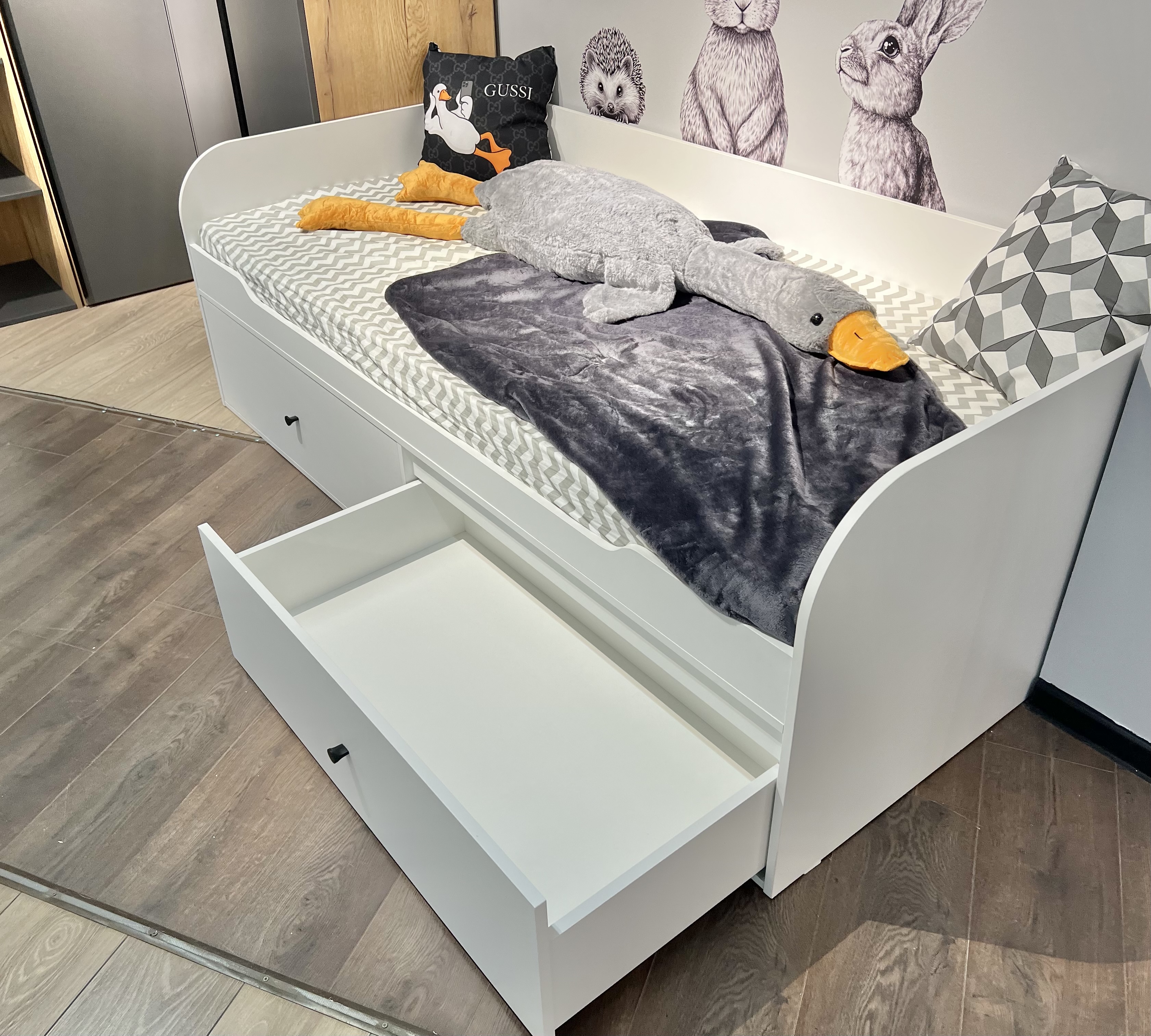 Высокая нагрузка на спальное место. Ящики кроватей с доводчиками. Прочные ящики! |