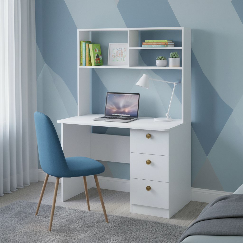 Практичный и удобный стол с надстройкой займет немного места в комнате и в тоже время позволит разместить учебники, любимые книги и игрушки.