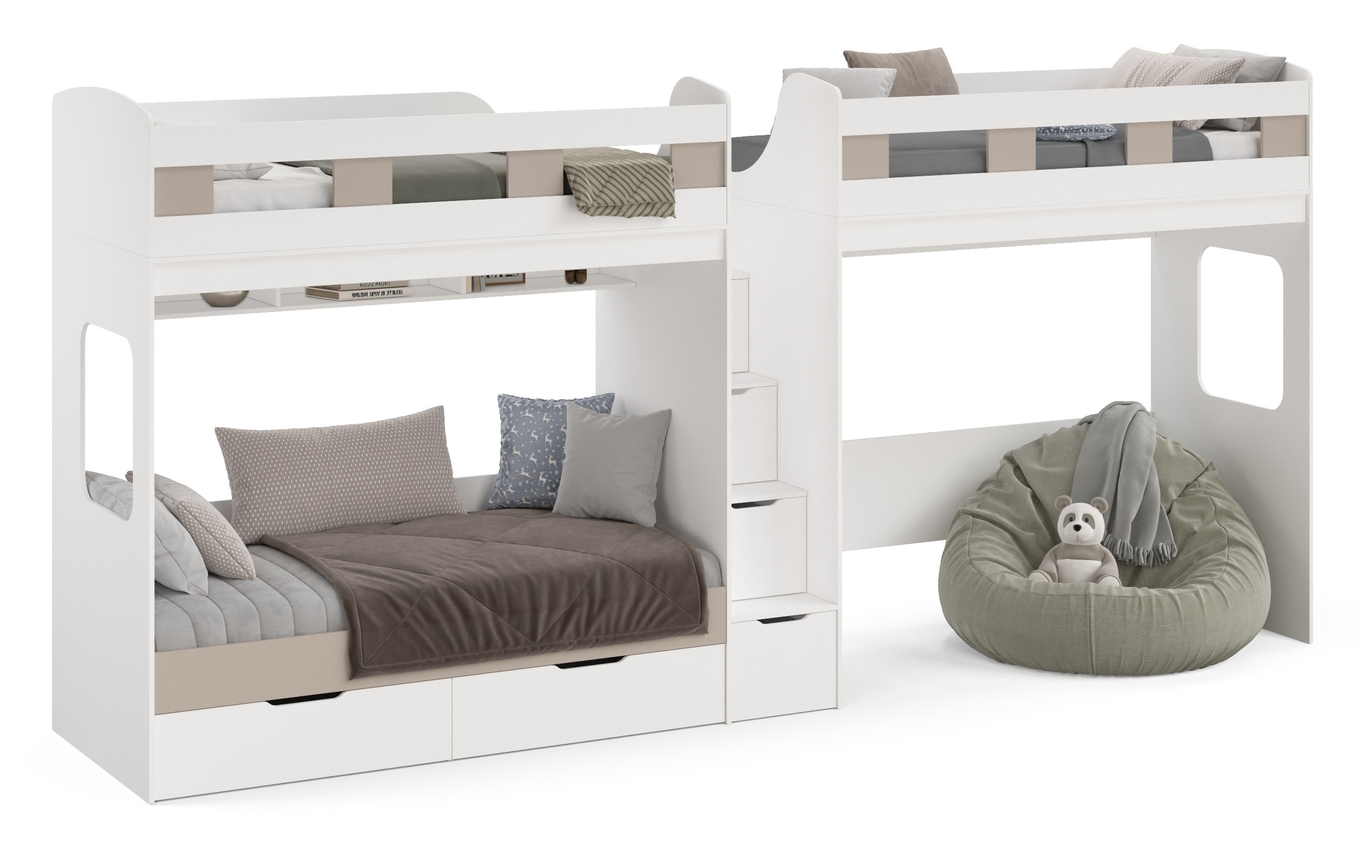 Высокая нагрузка на спальные места. Удобная лестница-комод. Высокие, безопасные бортики