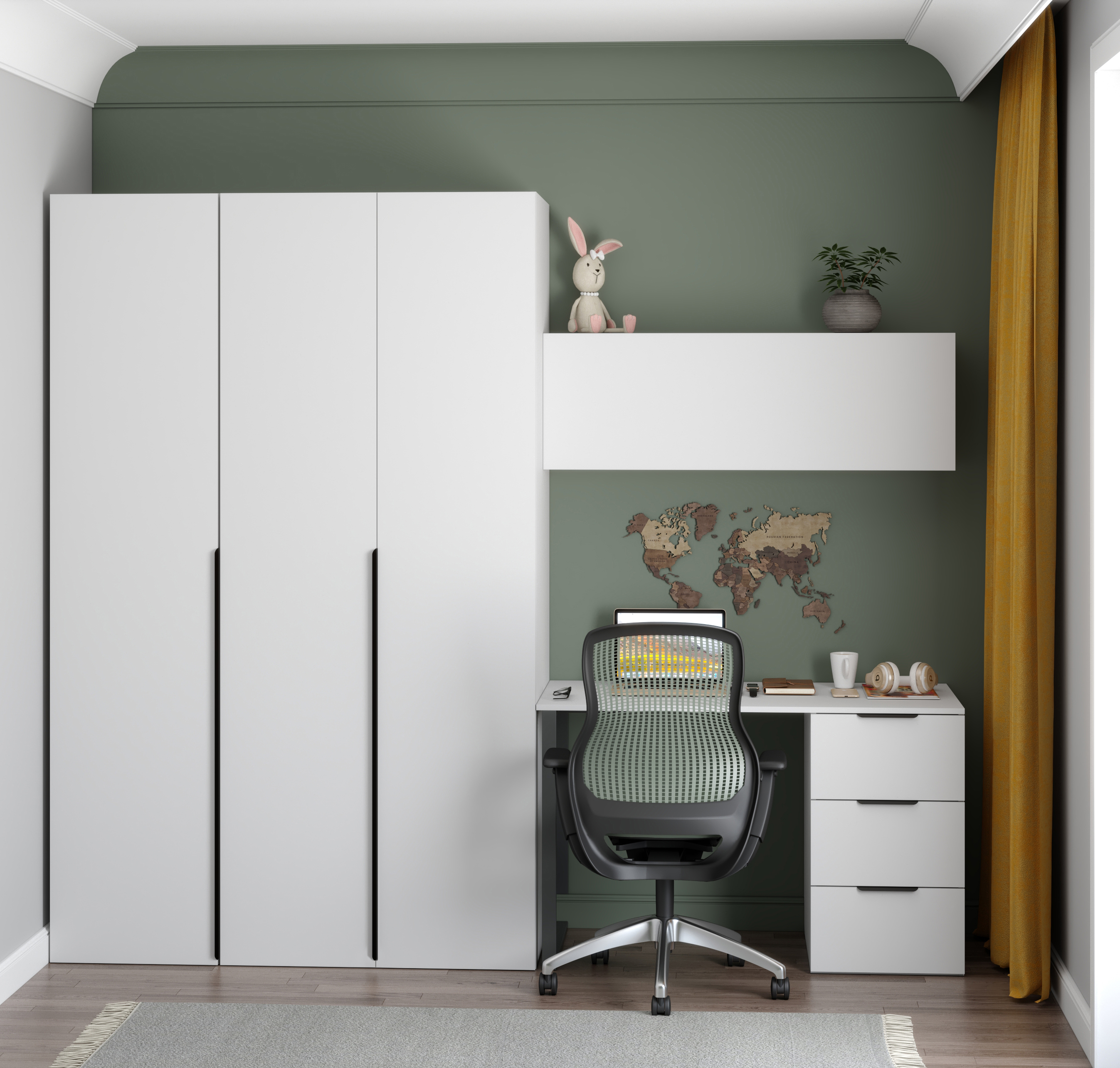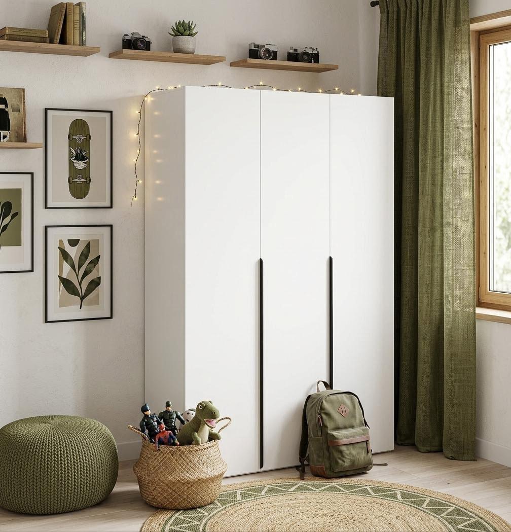 Шкаф имеет три распашные двери, которые оснащены доводчиками для плавного и бесшумного закрывания.