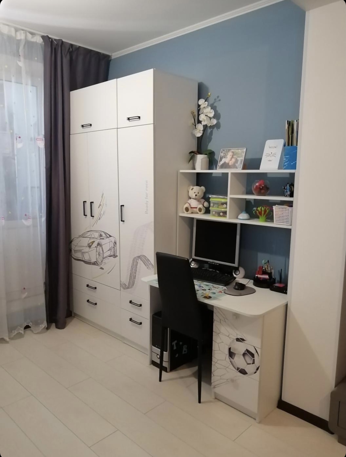 Мебель выполнена из сертифицированного, качественного, экологически чистого ЛДСП класса Е0,5 в белом цвете и оформлена дизайнерским принтом.