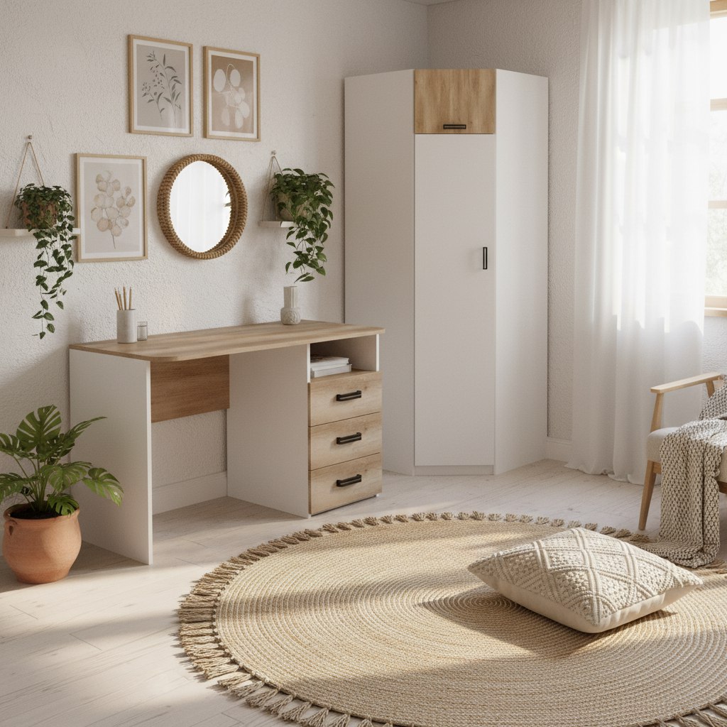 Мебель выполнена из качественного, экологически чистого ЛДСП класса Е0,5 в цветах дуб каньон + белый.