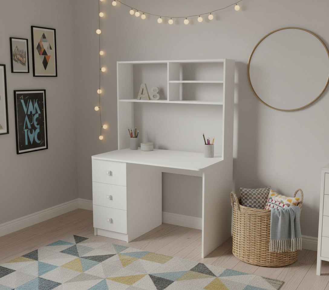 Практичный и удобный стол с надстройкой займет немного места в комнате и в тоже время позволит разместить учебники, любимые книги и игрушки.
