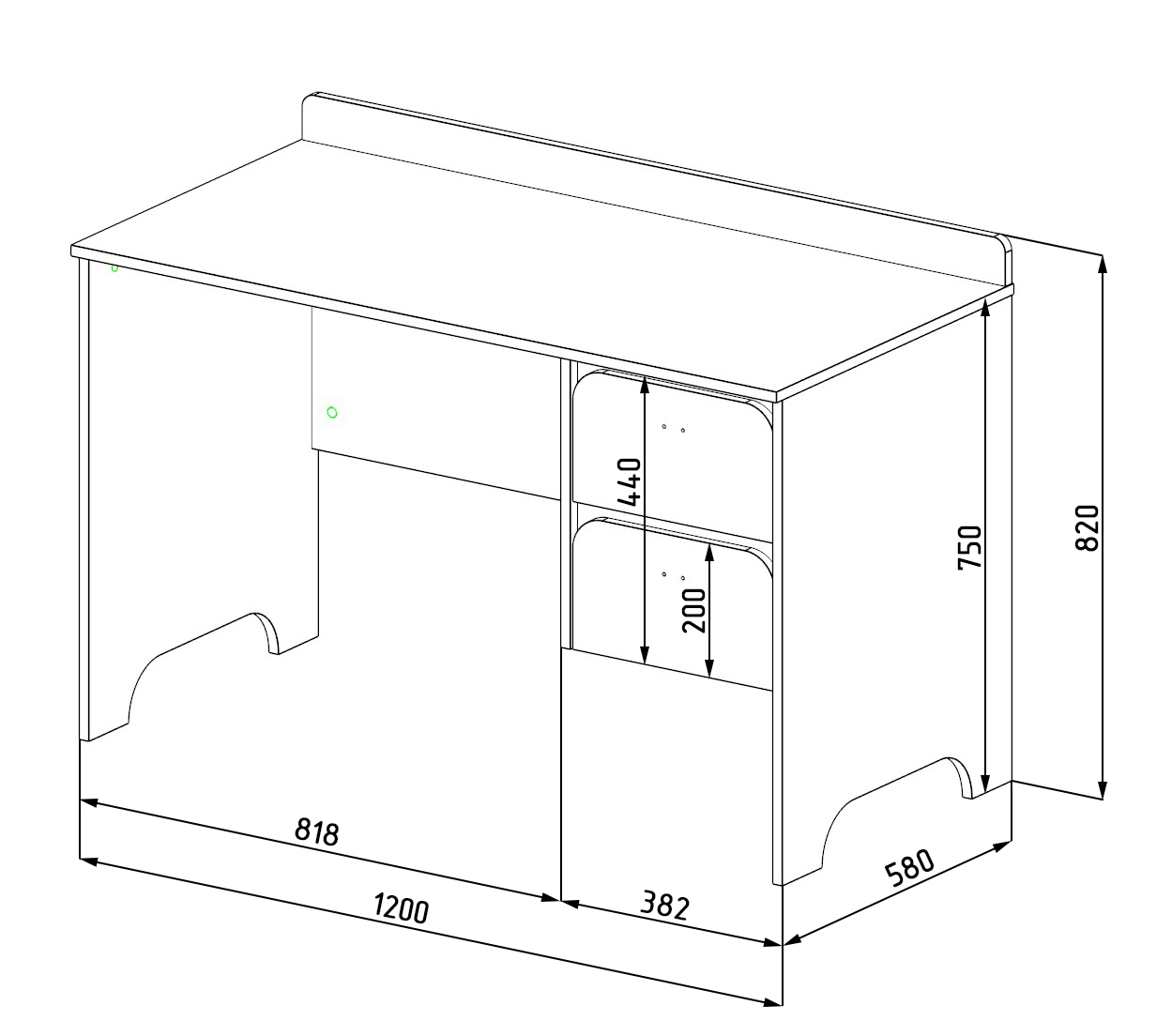 Габариты стола: ширина 1200, глубина 580, высота 740 мм