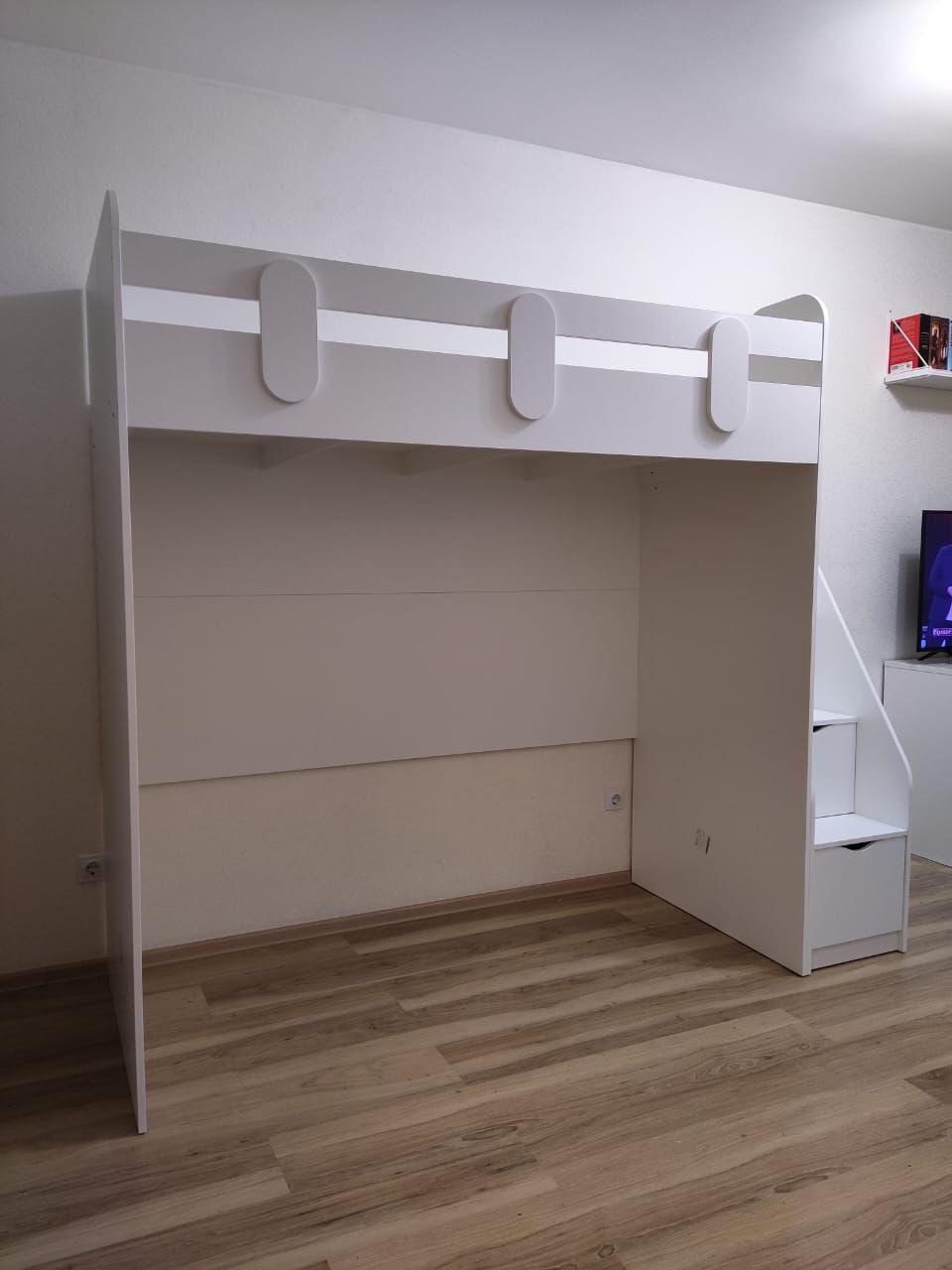 В лестницу встроены выдвижные ящики для игрушек - удобно и практично.