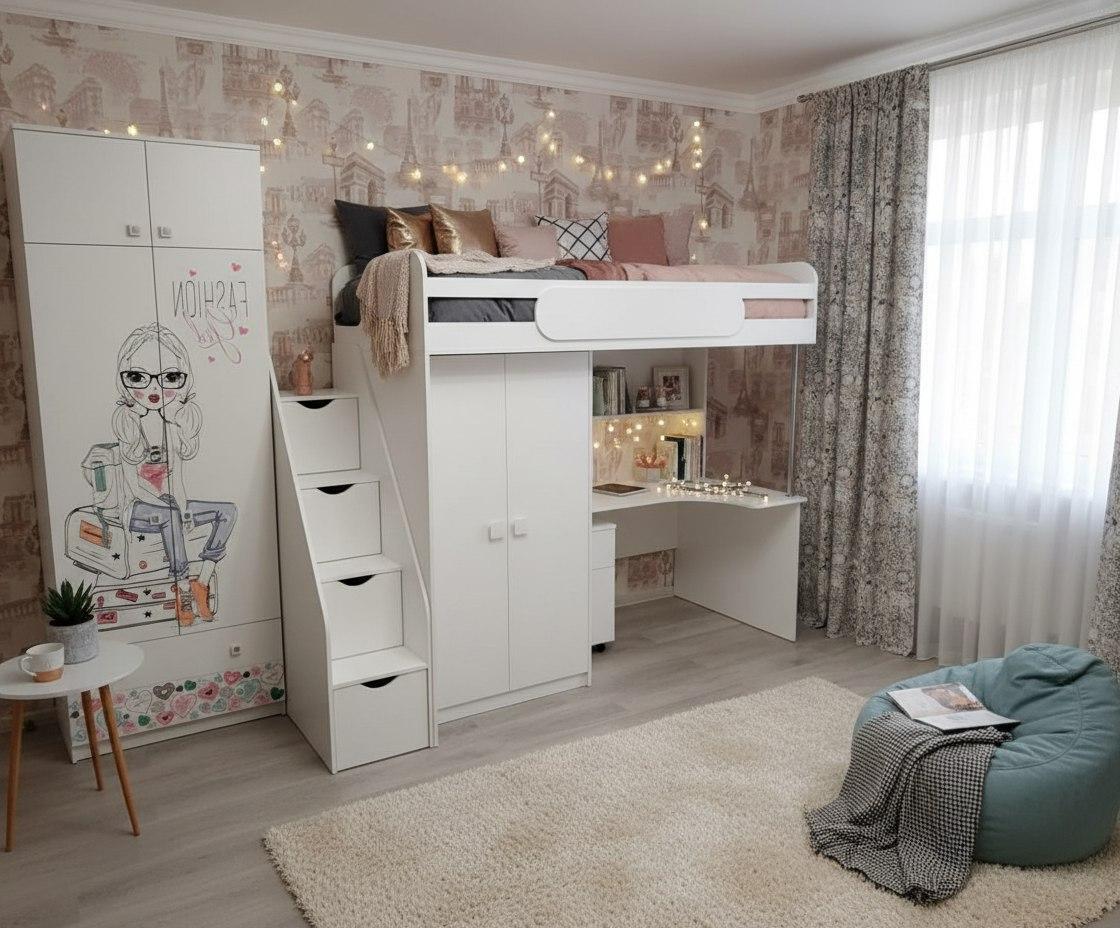 Кровать-чердак с рабочим пространством и шкафом – идеальное решение для детской комнаты.