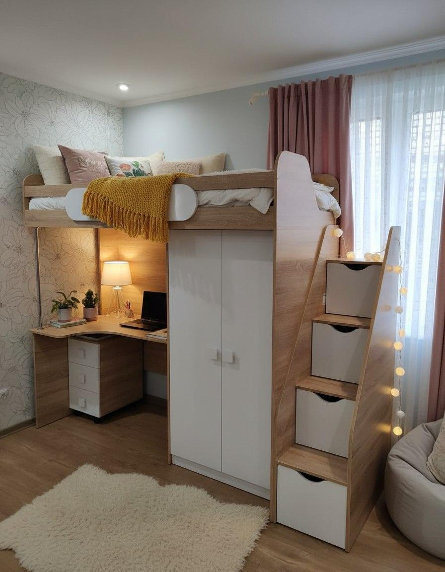 Экономия пространства: под кроватью расположен стол с тумбой для учебы и удобная полочка, а рядом – шкаф для хранения вещей.