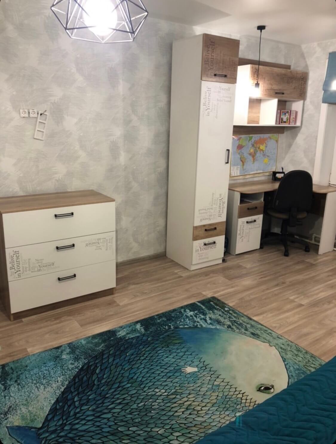 Мебель выполнена из сертифицированного, качественного, экологически чистого ЛДСП класса Е0,5 в сочетании цветов дуб каньон с белым и оформлена дизайнерским принтом.
