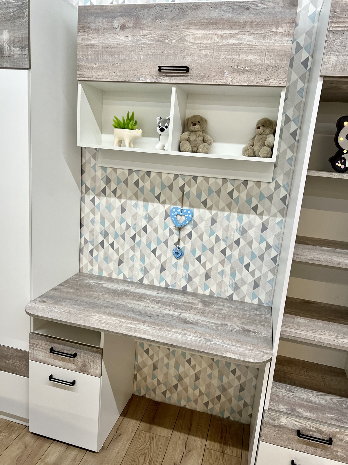 Мебель выполнена из сертифицированного, качественного, экологически чистого ЛДСП Е0,5 в сочетании цветов "бетон пайн" + белый.