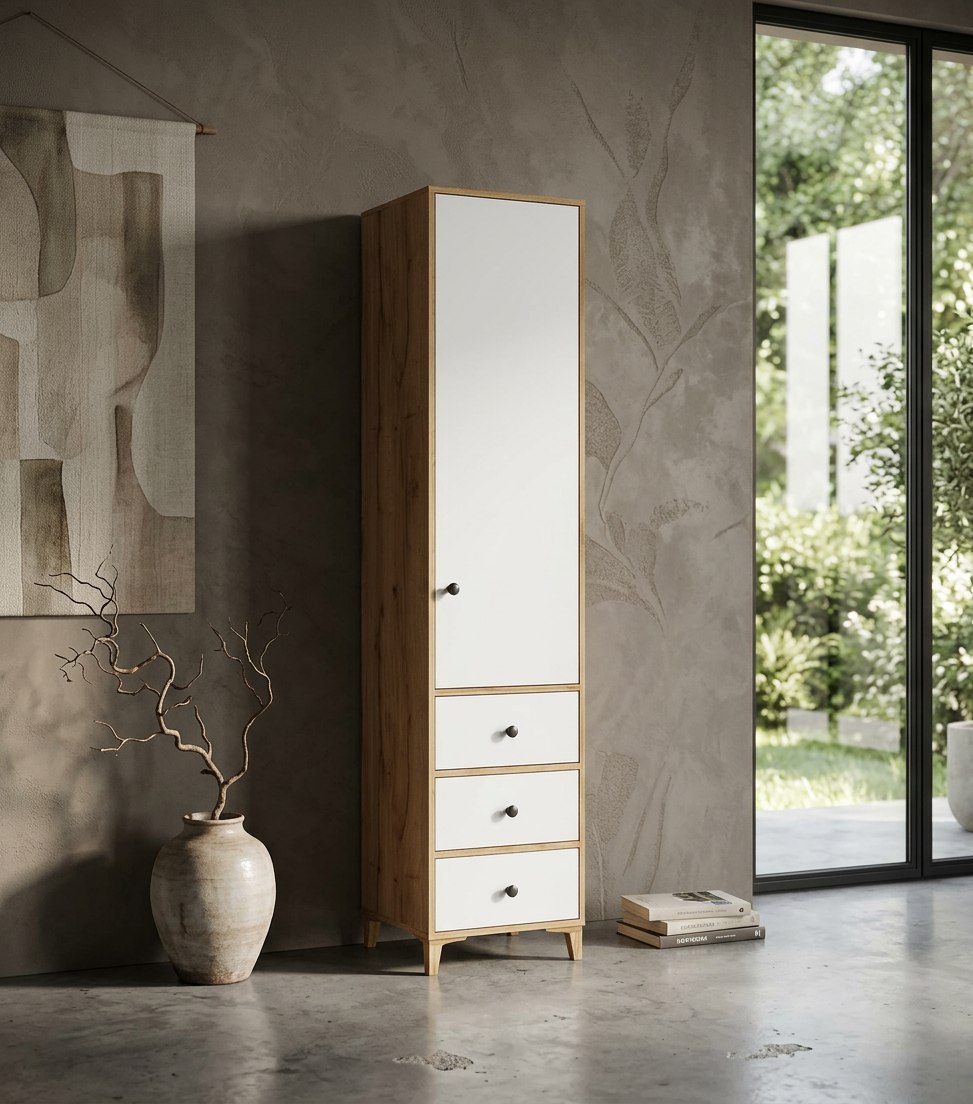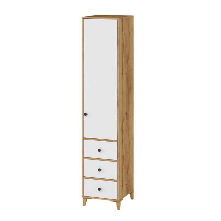 В пенал встроены три выдвижных ящика на направляющих скрытого монтажа с доводчиками.