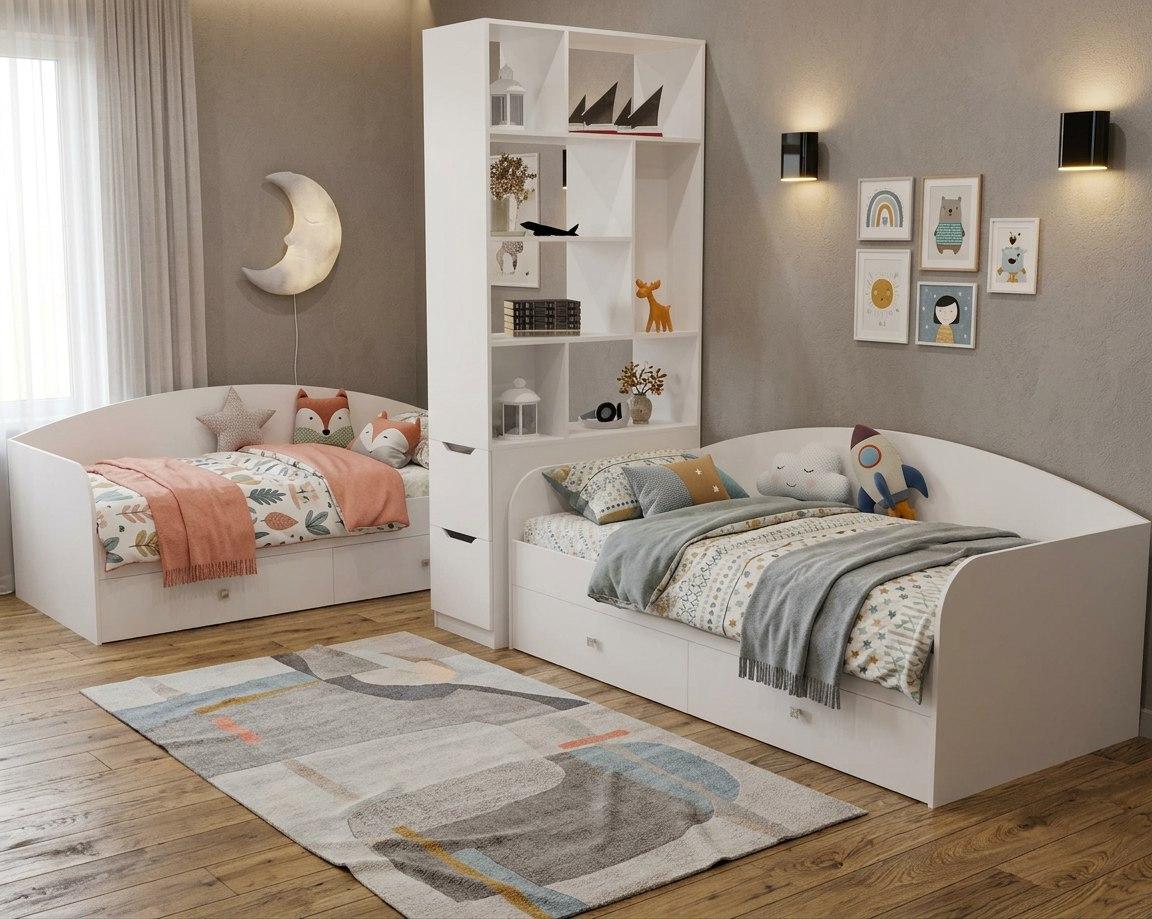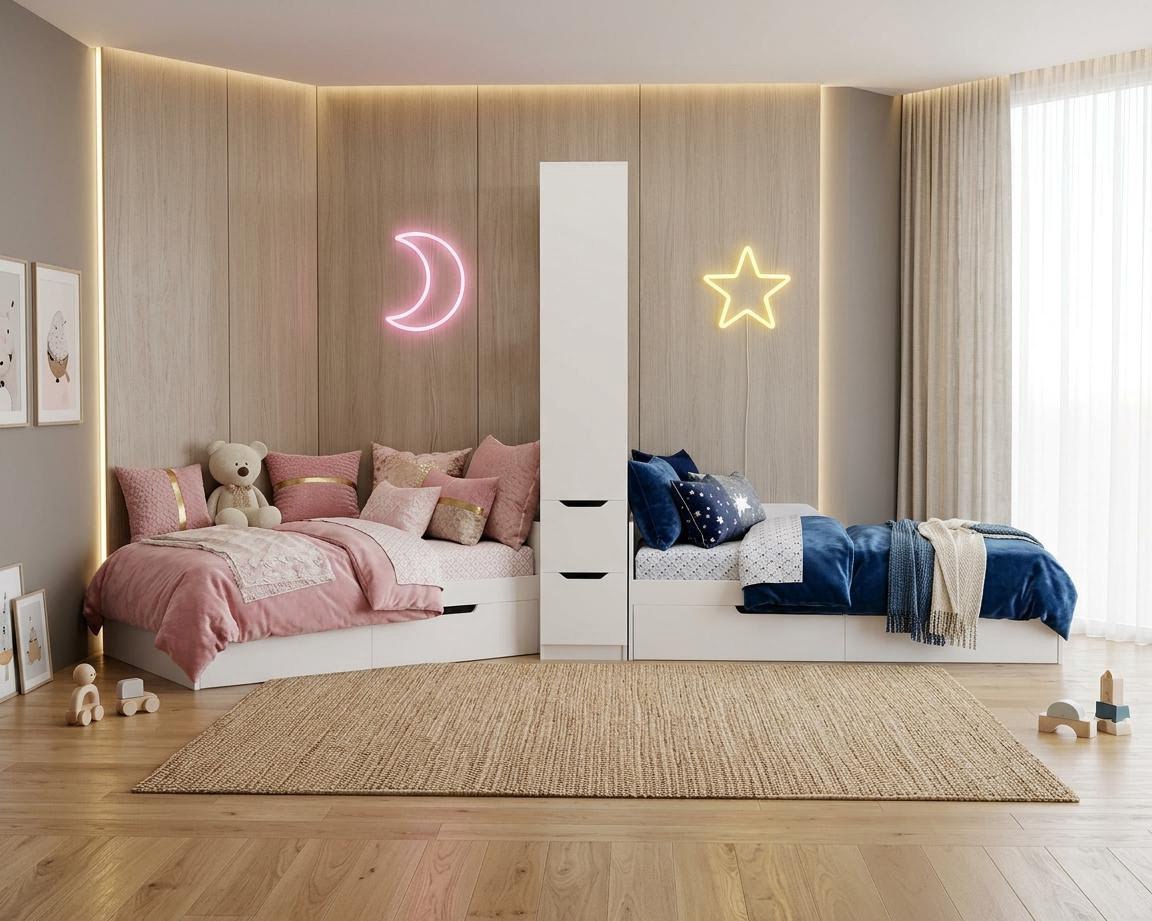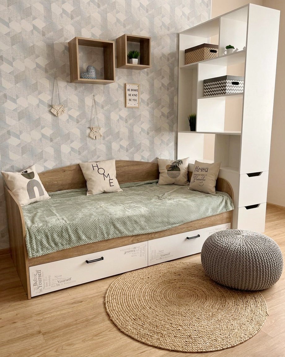 С помощью стеллажа можно разделить комнату на отдельные зоны: отдыха, учебы, встречи с друзьями, можно зонировать комнату для двоих детей.