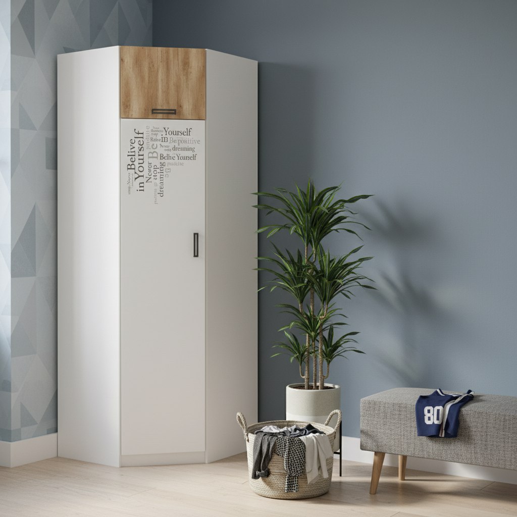 Мебель выполнена из сертифицированного, качественного, экологически чистого ЛДСП Е0,5 в сочетании цветов "дуб каньон + белый" и оформлена дизайнерским принтом.